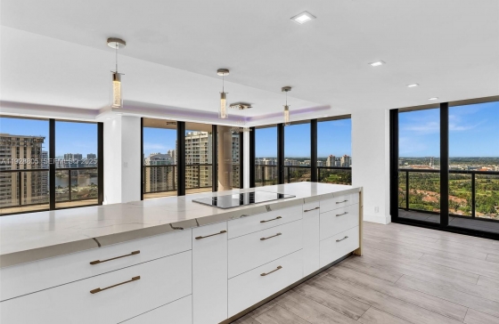 19667 Turnberry Way #27D, Aventura, FL, 33180 Beautifully renovated and oversized 2-bedroom, 2-bath corner residence with spectacular 360° views from sunrise to sunset. The modern open kitchen features high-gloss cabinetry, premium stainless-steel appliances, quartz waterfall counters, a full-height designer backsplash, home bar with wine cooler, built-in coffee system, and double ovens—perfect for everyday living and entertaining. The expansive living and dining areas are wrapped in floor-to-ceiling impact glass windows, opening to a deep wraparound balcony with panoramic ocean, city, and golf course views. The primary suite offers a spa-quality retreat with a large walk-in shower, freestanding soaking tub, double vanity, and an impressive boutique-style walk-in closet with center island and chandelier. The building features a resort-style pool, fitness center, updated lobby, valet, concierge, and 24-hour security. Ideally located in the heart of Aventura, just moments from premier shopping, dining, marinas, and houses of worship.