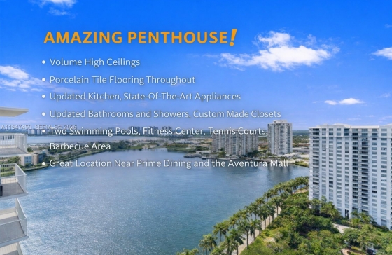 Experience Elevated Living In This Stunning Two Bedrooms And Two Bathrooms Penthouse Residence Ideally Located In The Heart Of Aventura. Just Moments From Aventura Mall, Fine Dining, And Houses Of Worship, This Home Offers The Perfect Blend Of Convenience, Comfort, And Lifestyle. Soaring High Ceilings Create A Bright, Airy Ambiance, While Porcelain Tile Floors Throughout Add A Sleek, Modern Finish. The Remodeled Kitchen Is Designed For Both Function And Style, Featuring Updated Appliances Including A State-of-the-art Samsung Refrigerator, Perfect For Everyday Living And Entertaining. The Spacious Primary Suite Is A True Retreat, Offering A Walk-in Closet With Custom Built-ins And A Remodeled Bathroom With Updated Showers And Elegant Glass Enclosures. Step Onto The Large Private Balcony Overlooking The Tranquil Lake And Enjoy Breathtaking Sunset Views That Transform Every Evening Into An Experience. Additional Features Include Hurricane Shutters And Thoughtfully Updated Interiors Throughout. Residents Enjoy Resort-style Amenities, Including Two Pools, Tennis Courts, Lush-landscaped Gardens, Barbecue Areas, And A Fully Equipped Fitness Center, All Within A Beautifully Maintained Community. This Aventura Penthouse Offers An Exceptional Lifestyle In A Prime Location.A11947450 Condo #2214E for Rent in Admirals Port, Aventura